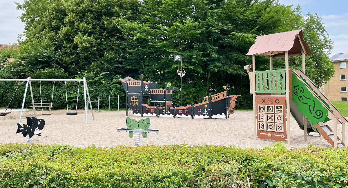 Ud over de klassiske legeredskaber til legepladser såsom gynger, sandkasser og legesystemer finder I også sportsudstyr, store klatrenet, borde og bænke og meget mere. På den måde kan I finde redskaber til både store og små arealer, ligesom I kan udbygge jeres legeplads til et udemiljø, der samler børn og voksne og kan blive et socialt samlingspunkt for lokalområdet.