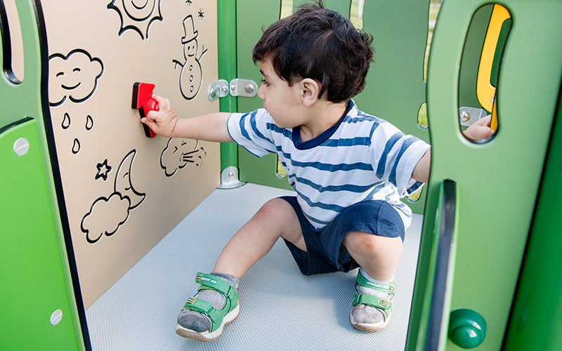 Designet i en højde, således en voksen nemt kan støtte barnet i legen.
