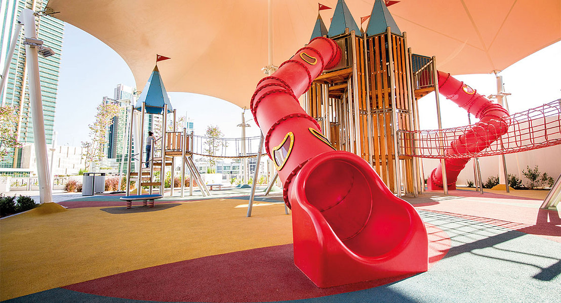 Blandt Abu Dhabis skyskrabere finder I en stor og spektakulær legeplads. Legepladsen er indrettet med masser af legeaktiviteter, kæmpe legetårne og et enormt solsejl for at beskytte børnene mod den hårde sol. For at gøre legetårnene endnu mere iøjnefaldende og fyldt med legeværdi, er de designet med to store tunnelrutsjebaner, som fører børnene fra toppen af tårnene og ned til jorden igen.
