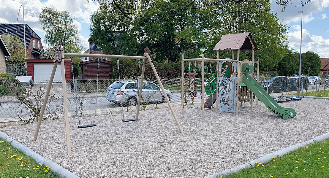 På Nattergalvej 4 i Randers er opført en ny Explore legeplads med legesystemet Lumka og et Explore gyngestativ med to sæder.