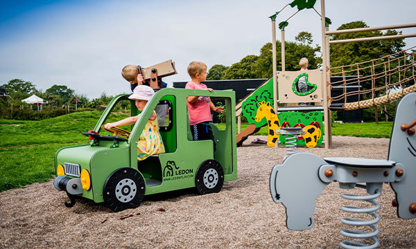 Off-Roaderen suser gennem junglen, aberne svinger sig i lianerne, mens giraffer og elefanter spejder over savannen. Gå på opdagelse og udforsk en ny verden med junglehytter, netsluser og vilde rutsjebaner for børn i alderen 2-8 år.